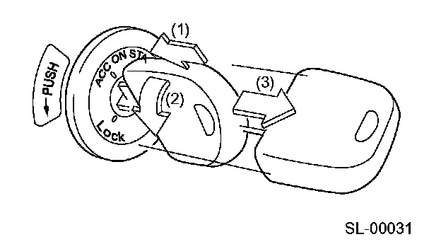 - The ignition switches on the MT models have a safety mechanism that prevents inadvertent locking of the steering wheel during driving. The driver cannot turn the ignition key from "ACC" to "LOCK" unless the key is pushed inward at the "ACC" position (arrow 1 in the drawing above).