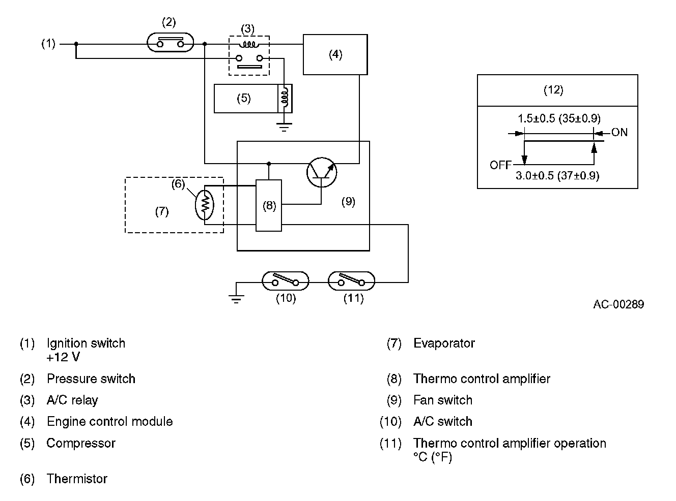 The thermo control amplifier disconnects the magnet clutch circuit to prevent the evaporator from becoming frosted when the temperature of the evaporator fin drops close to 3 °C (37 °F). When the limit temperature is reached, the thermistor (located on the evaporator fin) interrupts the base current of the amplifier. This deactivates the A/C relay, which in turn disconnects the magnet clutch circuit.
