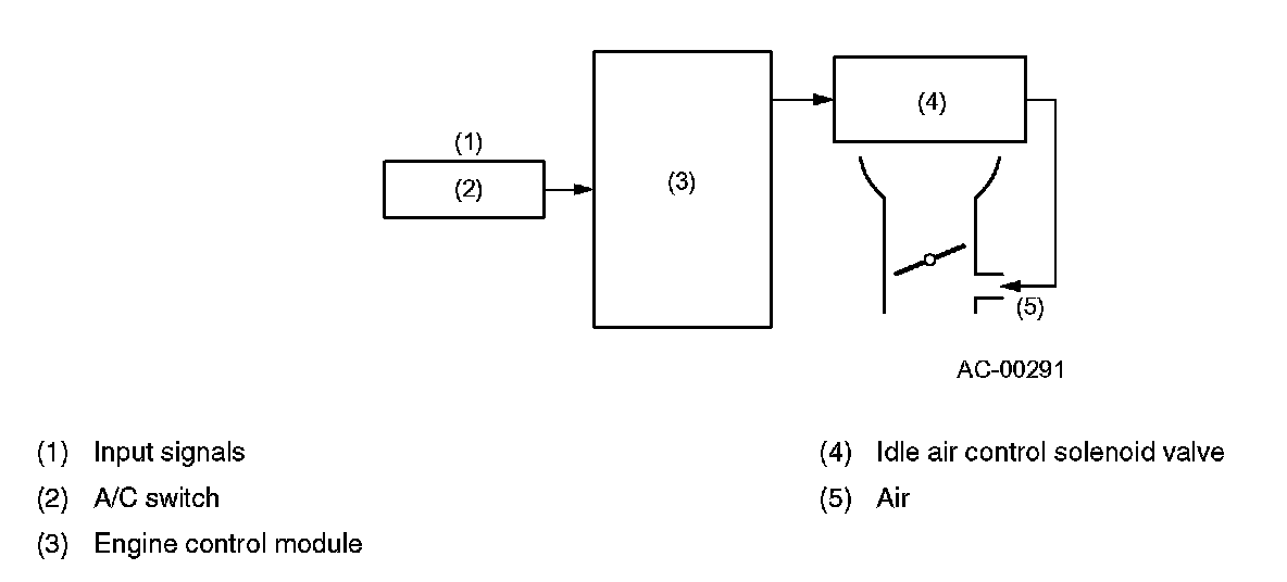The engine control module activates the idle air control solenoid valve when it receives an A/C switch ON signal so that necessary by-pass air is introduced into the throttle body to ensure proper idling speed for an increased engine load.