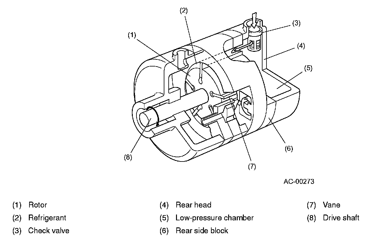 Low-pressure gaseous refrigerant is forced out from the evaporator by rotation of the compressor. It enters the low-pressure chamber in the rear head through the check valve. The refrigerant is then drawn into the cylinder by rotation of the vane-fitted rotor through the two suction ports provided in the rear side block. Air tightness of the cylinder chambers is maintained by the compressor oil.