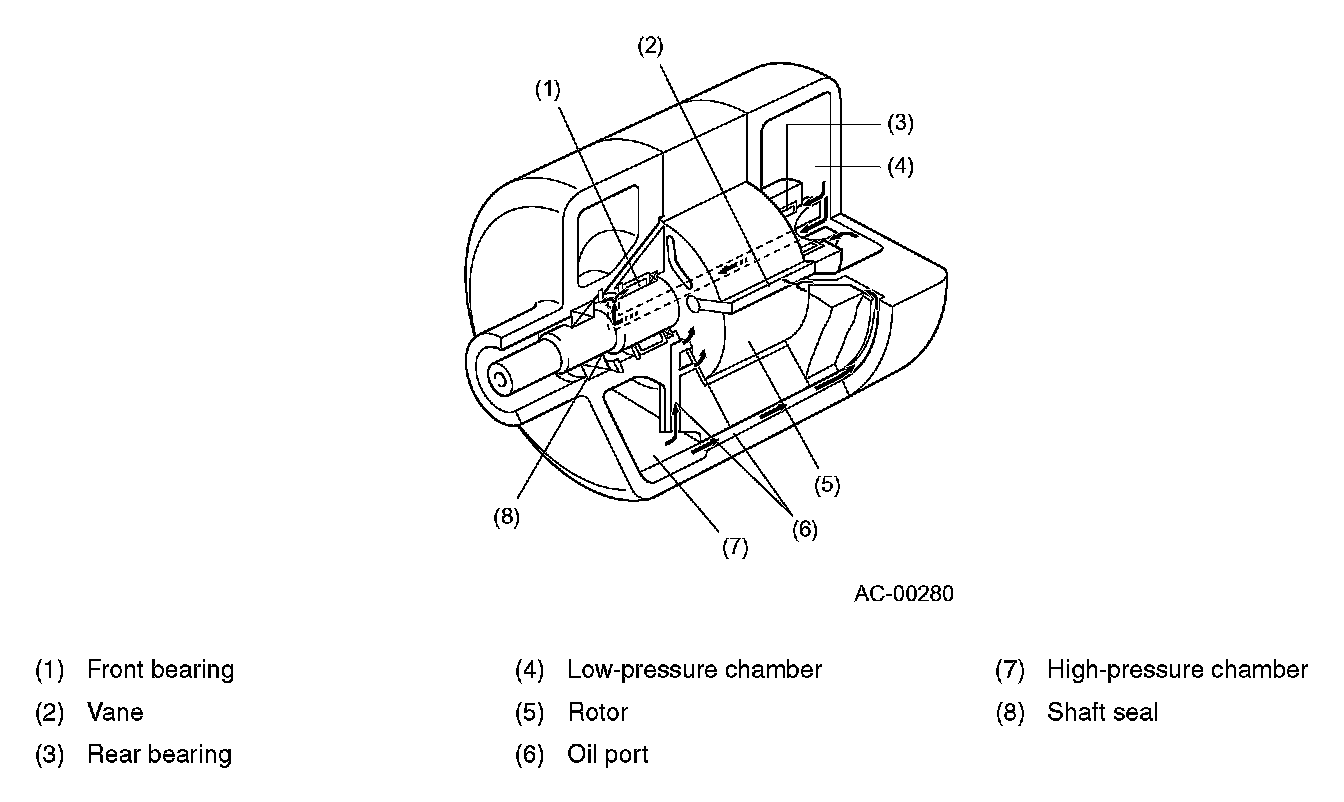 The lubrication oil is collected at the bottom of the high-pressure chamber. The high-refrigerant pressure in the chamber forces the oil upward through the oil passages in the front side block to lubricate the front end of the rotor. The high-chamber pressure also forces the oil through the passages in the bottom of the cylinder to lubricate the rear end of the rotor. The oil that has lubricated each end of the rotor enters the low-pressure chamber by the internal pressure of the compressor. The oil contained in the gaseous refrigerant from the evaporator passes through the low-pressure chamber and lubricates the rear bearing. The oil also passes through the passage in the drive shaft and lubricates the front bearing and shaft seal before entering the suction port of the cylinder.