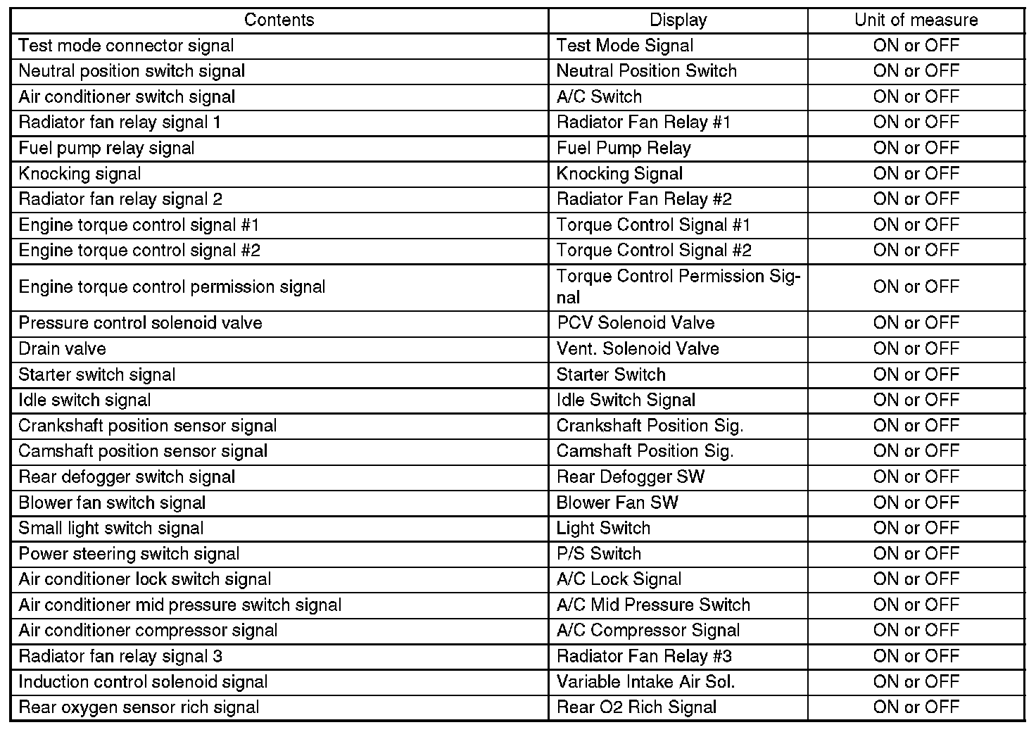 The signal which notifies whether or not torque down is possible is displayed. This signal is transmitted from the ECU in response to a torque down signal from the TCU. When torque down is prohibited, ON is displayed. When permitted, OFF is displayed.