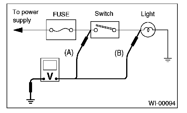 2. Contact the positive probe of the voltmeter on connector (A). The voltmeter will indicate a voltage.