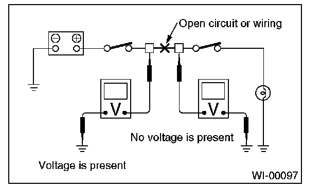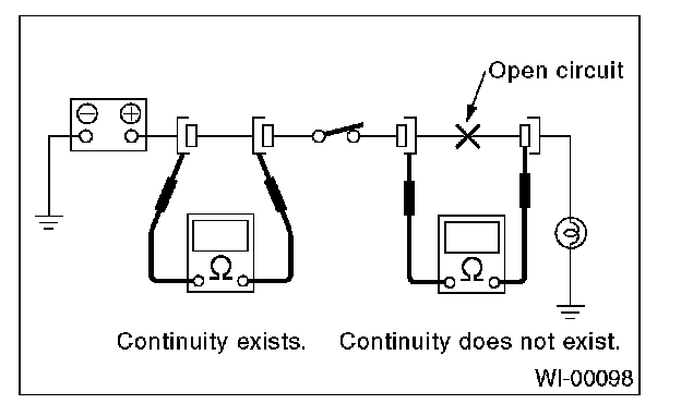 Disconnect all connectors affected, and check the continuity in wiring between adjacent connectors. When the ohmmeter indicates infinite , the wiring is open.