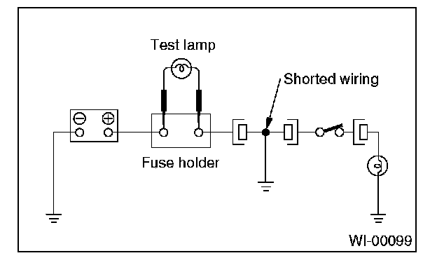 Connect a test lamp (rated at approx. 3 watts) in place of the blown fuse and allow current to flow through the circuit. Disconnect one connector at a time from the circuit, starting with the one located farthest from power supply. If the test lamp goes out when a connector is disconnected, the wiring between that connection and next connector (farther from the power supply) is shorted.