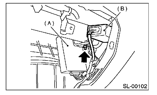 3. Remove nut, then remove keyless entry control module (B) and the other electrical control module (A) while disconnecting connector.
