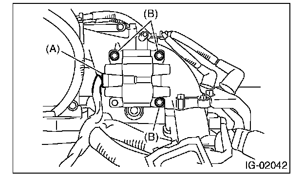 4. Remove the bolt (B) which secures the Ignition Coil and Ignitor ASSY to intake manifold.