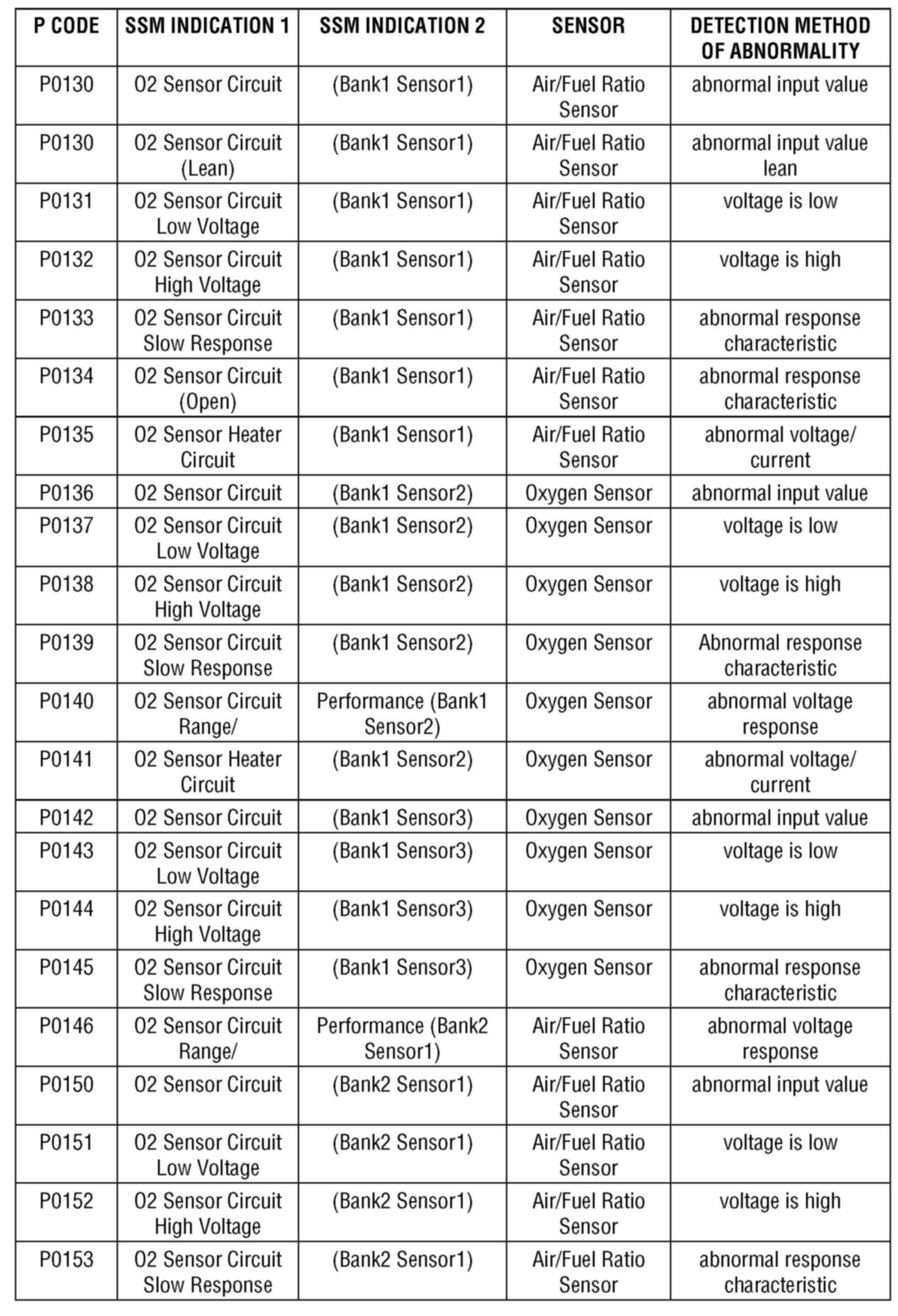 The list above is of O2 Sensor related DTCs. (This list is for example only. Refer to the applicable service manual for a complete list of DTCs.)