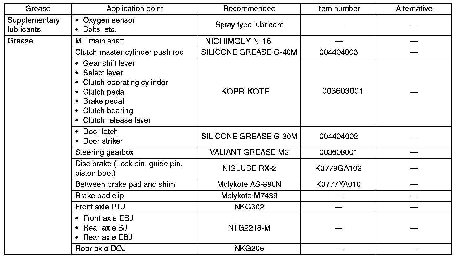 Use the grease and supplementary lubricants shown in the table.