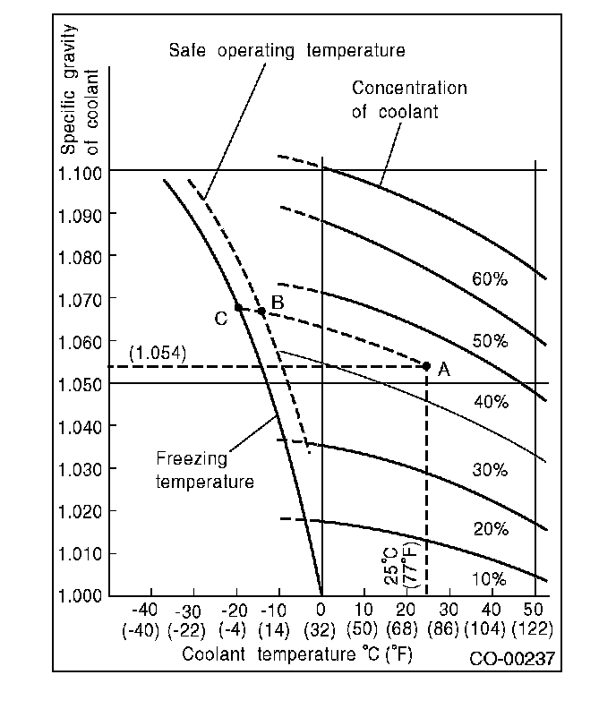 If the coolant temperature is 25°C (77°F) and its specific gravity is 1.054, the concentration is 45% (point A), the safe operating temperature is -14°C (7°F) (point B), and the freezing temperature is -20°C (-4°F) (point C).