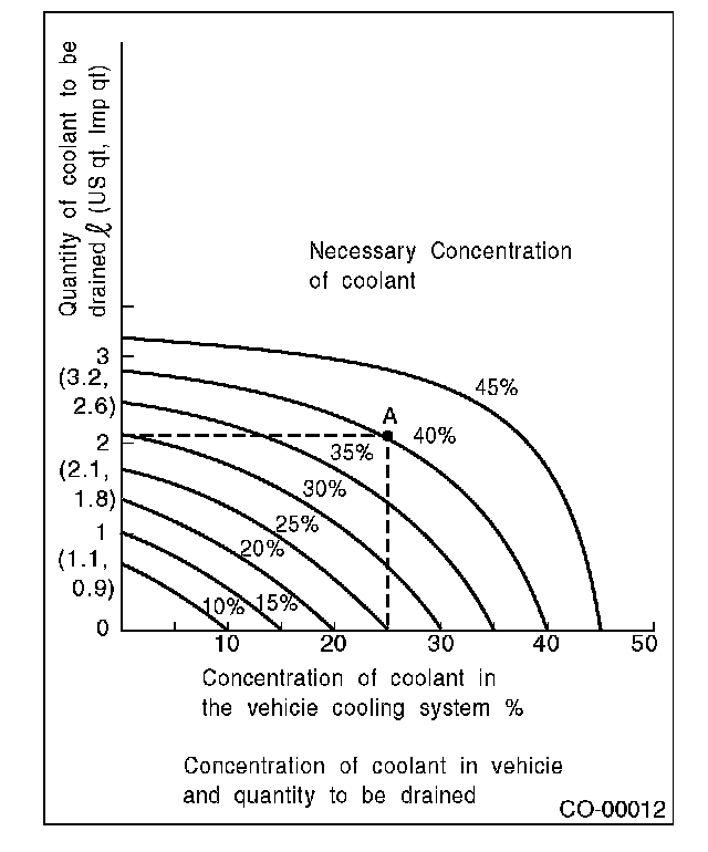 Assume that the coolant concentration must be increased from 25% to 40%. Find point A, where the 25% line of coolant concentration intersects with the 40% curve of the necessary coolant concentration, and read the scale on the vertical axis of the graph at height A. The quantity of coolant to be drained is 2.1 L (2.2 US qt. 1.8 Imp. qt.). Drain 2.1 L (2.2 US qt., 1.8 Imp. qt.) of coolant from the cooling system and add 2.1 L (2.2 US qt., 1.8 Imp. qt.) of the undiluted solution of SUBARU coolant.