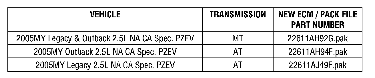 Home >> Subaru >> 2005 >> Outback F4-2.5L SOHC >> Repair and Diagnosis >> Powertrain Management >> Computers and Control Systems >> Engine Control Module >> Technical Service Bulletins >> Recalls >> Recall - ECM Update For Catalyst Efficiency (Ca. Spec.) >> Overview