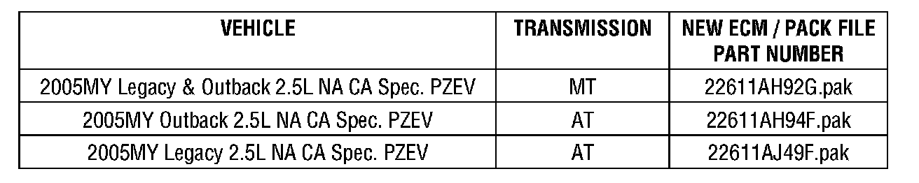 Home >> Subaru >> 2005 >> Outback F4-2.5L SOHC >> Repair and Diagnosis >> Powertrain Management >> Computers and Control Systems >> Engine Control Module >> Technical Service Bulletins >> Recalls >> Recall - ECM Update For Catalyst Efficiency (Non-Ca.) >> Overview