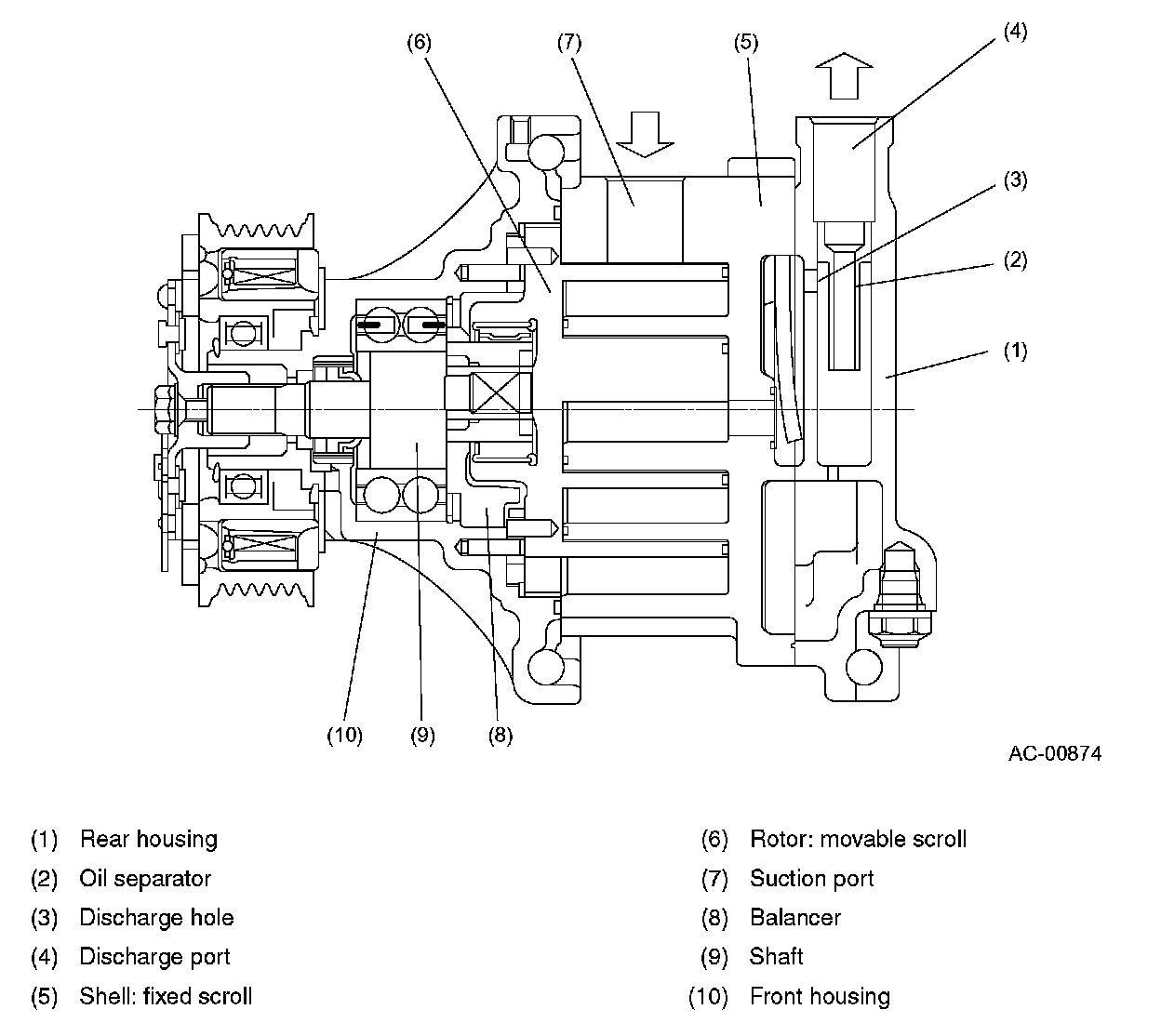 COMPRESSORAs two scrolls (one movable and other fixed) are engaged, a crescent chamber is formed between multiple contact points. The movable scroll cannot rotate on its own axis but orbits instead, so the operating chamber moves inwards while its capacity is reduced. Intake, compression and discharge take place simultaneously at multiple operation chambers, and compressed refrigerant is sent from the discharge hole at the center to the oil separator and then separated in to refrigerant gas and oil before it is output from the discharge port.