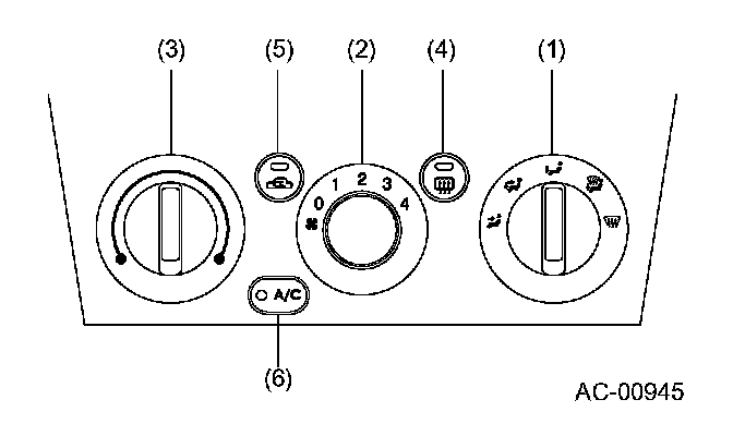 When this switch is turned ON the system enters auto air conditioning mode and automatically controls the blower fan speed, air outlet, fresh/recirculation switching, and compressor operation.