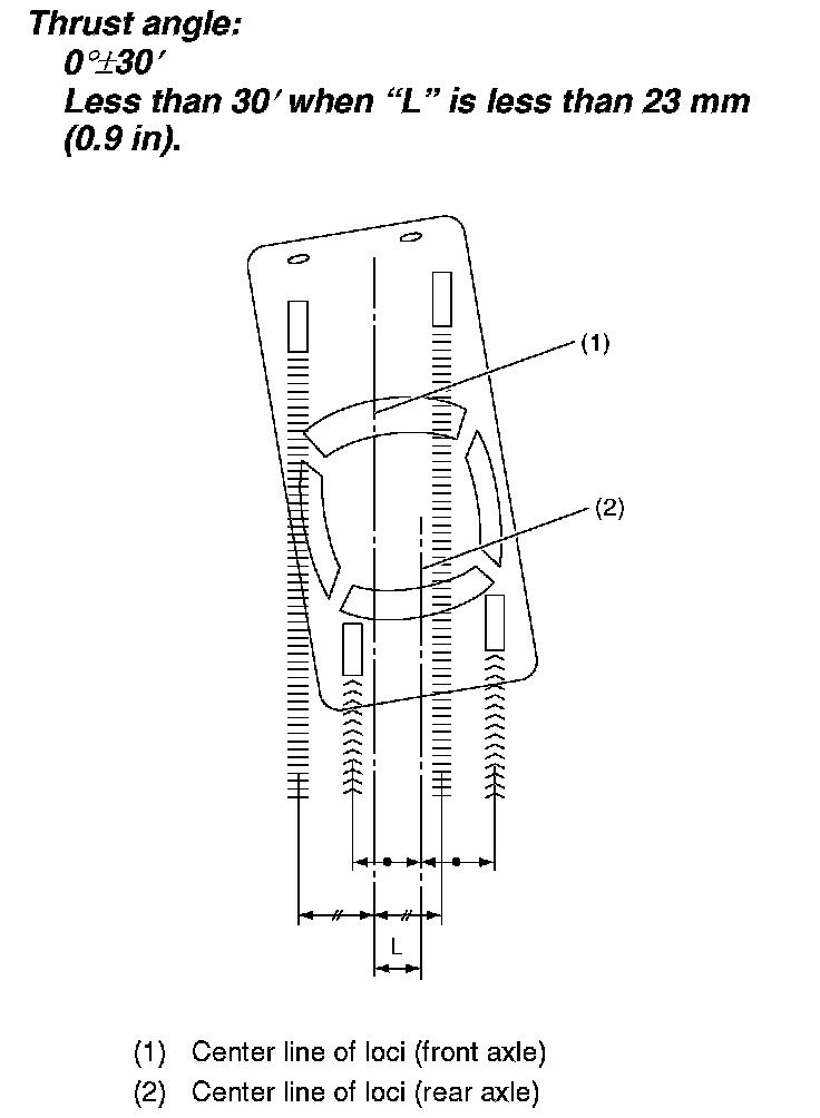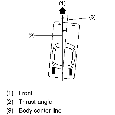 NOTE: Thrust angle refers to a mean value of left and right rear wheel toe angles in relation to the vehicle body center line. Vehicle is driven straight in the thrust angle direction while slanting in the oblique direction depending on the degree of the mean thrust angle.