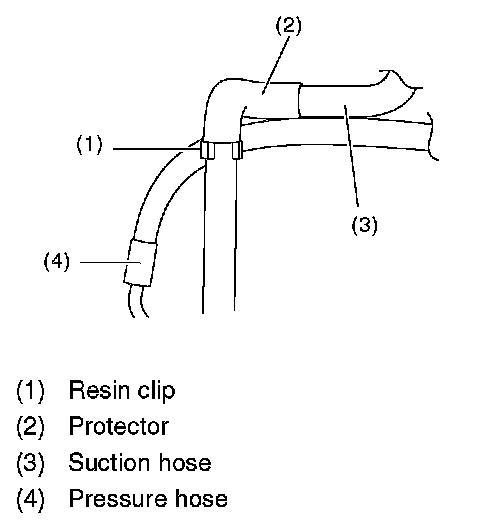 CAUTION: Align the installation position of the resin clip with the protector edge of suction hose.