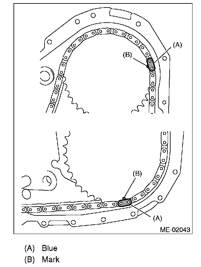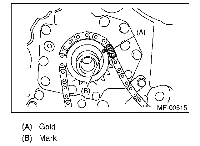 Align the timing mark (B) on the crank sprocket with mark (A) on the timing chain (LH).