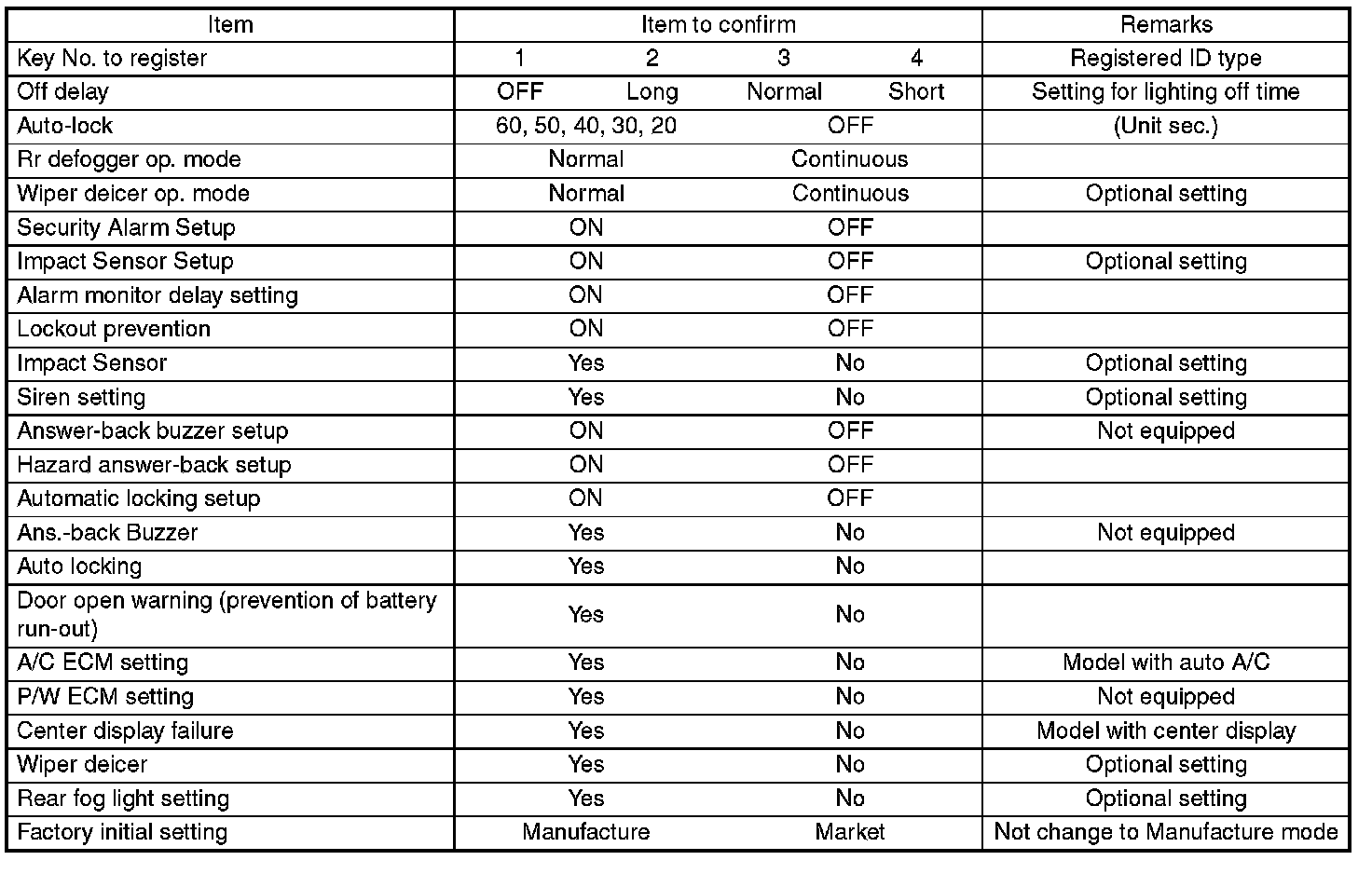 Each settings have been set. It can be recognized by key illumination coming on in concocting with room light and going off with ignition switch turned to ON.
