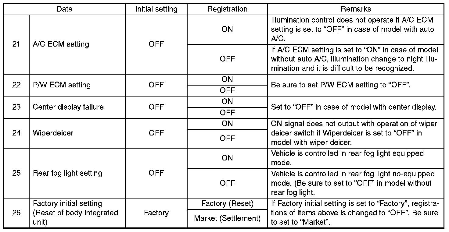 - Be sure not to change Factory initial setting except installation of new body integrated unit.