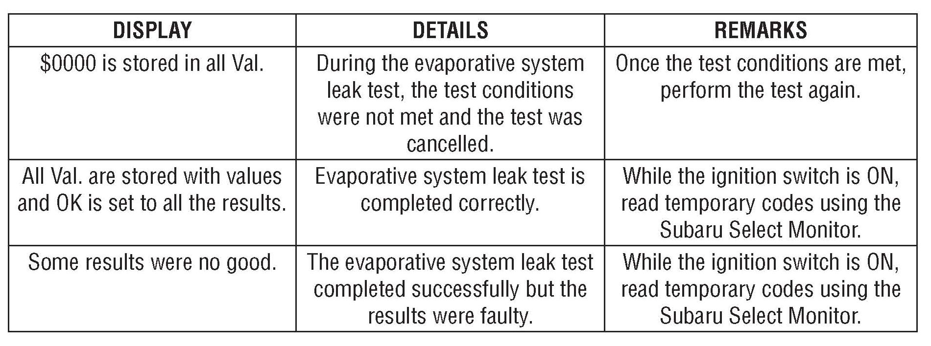 ^ The Subaru Select Monitor screen does not change after the evaporative system leak test is complete or when the test is aborted by turning off the ignition switch.