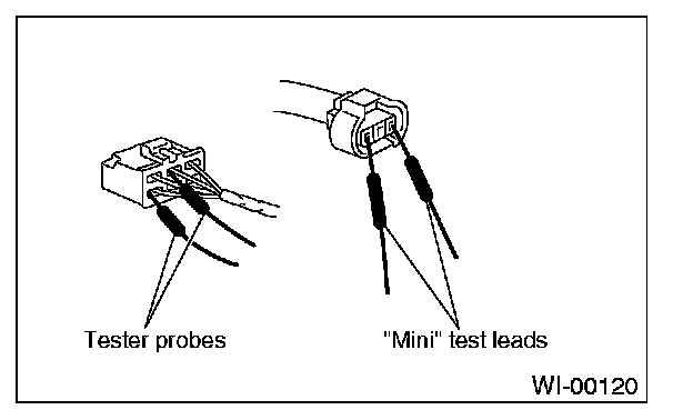 6. When checking continuity between connector terminals, or measuring voltage across the terminal and ground, always contact tester probe(s) on terminals from the wiring connection side. If the probe is too thick to gain access to the terminal, use "mini" test leads.