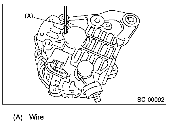Before assembling, press the brush down into brush holder, and then fix them in that position by passing a [1 mm (0.08 in) dia. 40 to 50 mm 1.6 to 2.0 in) long] wire through the hole as shown in the figure.