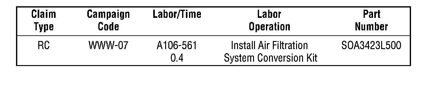 Air Filtration System Conversion Kit - Use the applicable claim submission information for installation of the Air Filtration System Conversion Kit and enter labor operation A106-561, for 0.4 labor hours.