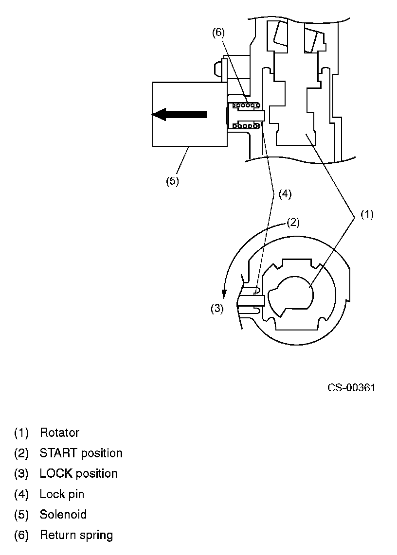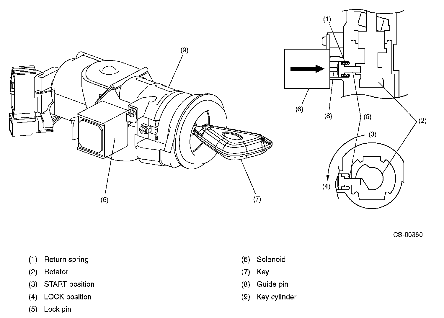 - When the select lever is at any position other than P, the solenoid is energized and its guide pin extends to hold the lock pin in its pushed out position. Held in its extended position, the lock pin interferes with the stopper portion of the rotator which turns together with the ignition key. Thus, the ignition key cannot be rotated to the "LOCK" position.