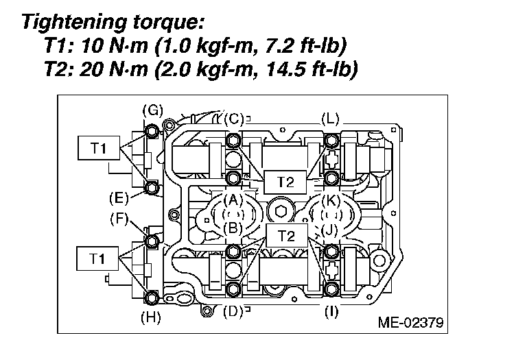 Tighten all bolts to 49 Nm (5.0 kgf-m, 36 ft. lbs.) in alphabetical sequence.