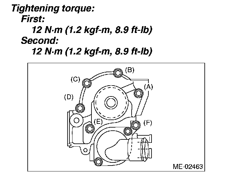 When installing the water pump, tighten the bolts in two stages in alphabetical sequence as shown in figure.