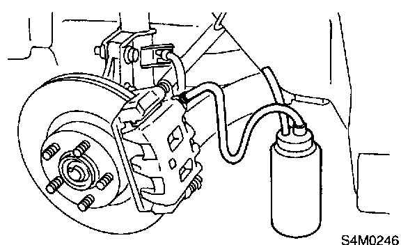 8) Release the brake pedal slowly. Repeat steps 6) through 8) until there are no air bubbles in the drained brake fluid and new fluid flows through vinyl tube.