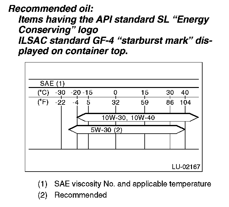 CAUTION: It is acceptable to fill an engine with oil of another name when replacing oil, but use an API standard specified by Subaru or one that has SAE viscosity number.