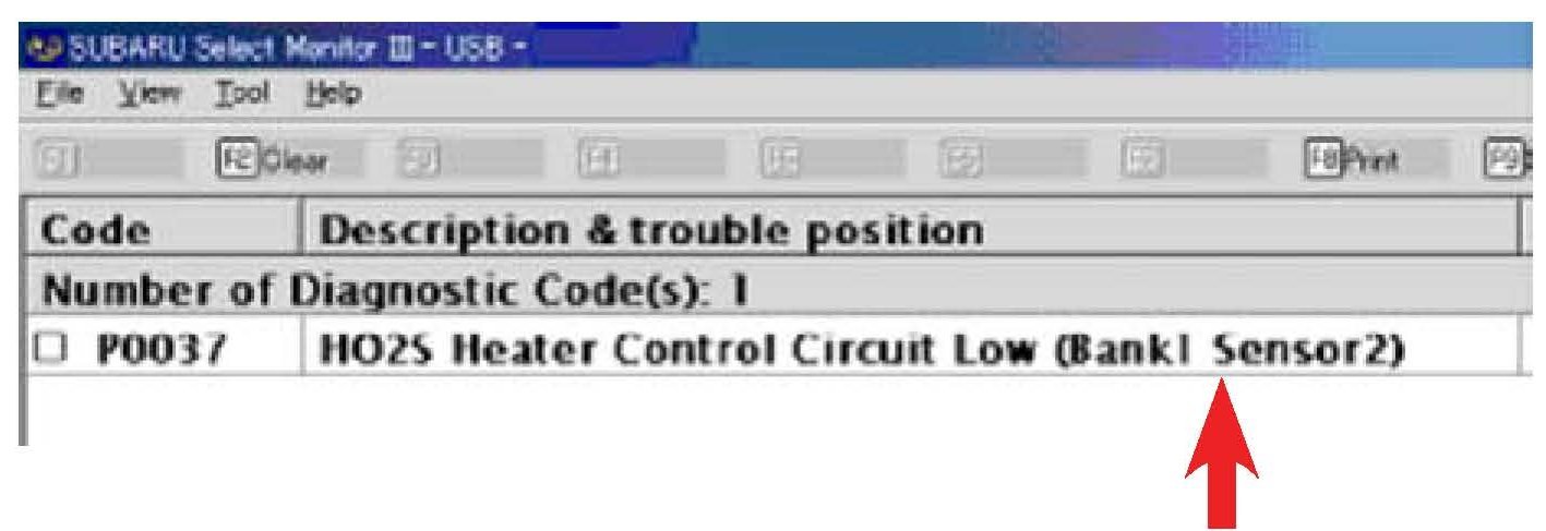 Example: DTC P0030 HO2S HEATER CONTROL CIRCUIT (Bank 1 Sensor 1). This DTC is referring to the A/F sensor and since it is on a 2007 Forester there is only one A/F sensor and one O2 sensor.