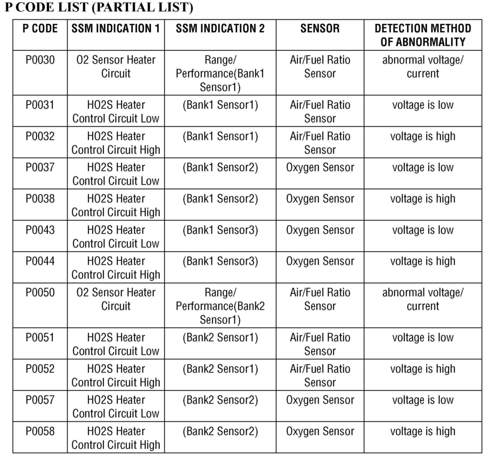 The list above is of O2 Sensor related DTCs. (This list is for example only. Refer to the applicable service manual for a complete list of DTCs.)