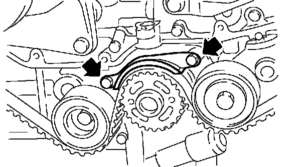 2. Using white paint, put an alignment mark or an arrow mark on timing belts in relation to the crank sprocket and cam sprockets.