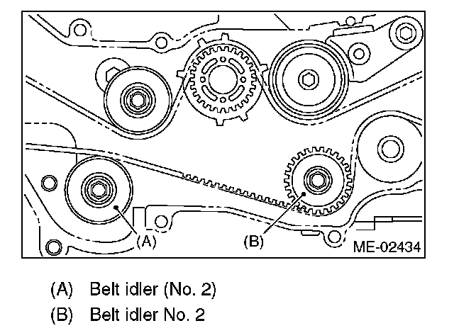 2. While aligning the alignment mark (B) on timing belt with the mark (A) on sprockets, position the timing belt properly.