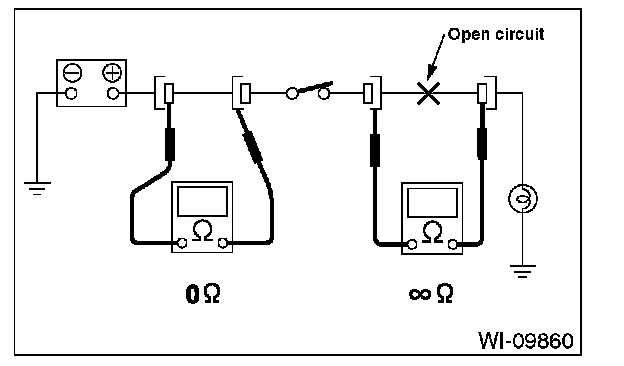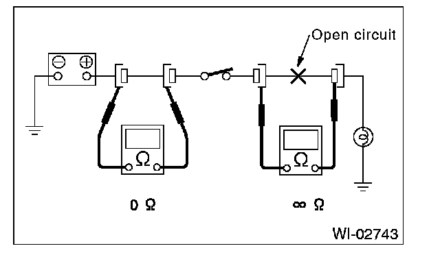 Disconnect all connectors affected, and check continuity in the wiring between adjacent connectors. When the ohmmeter indicates infinite , the wiring is open.