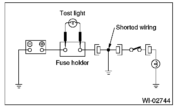 Connect a test light (rated at approx. 3 watts) in place of the blown fuse and allow current to flow through the circuit. Disconnect one connector at a time from the circuit. Starting with the one located farthest from the power supply. If the test light goes out when a connector is disconnected, the wiring between that connector and the next connector (farther from the power supply) is shorted.