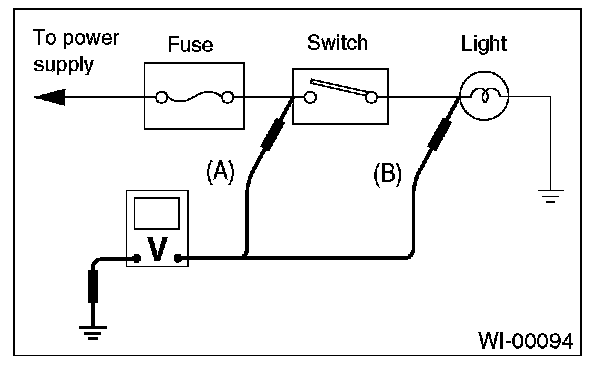 2. Contact the positive lead of the voltmeter on connector (A). The voltmeter will indicate a voltage.