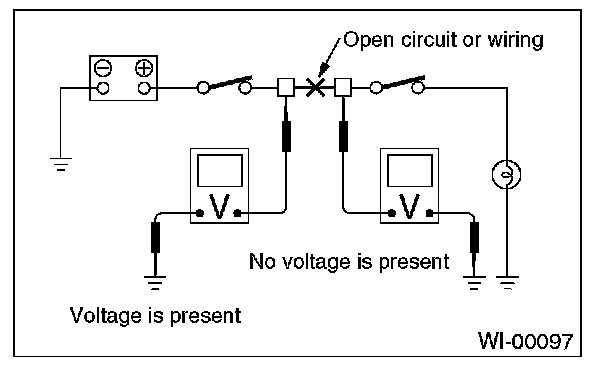 An open circuit is determined by measuring the voltage between respective connectors and ground using a voltmeter, starting with the connector closest to the power supply. The power supply must be turned ON so that current flows in the circuit. If voltage is not present between a particular connector and ground, the circuit between that connector and the previous connector is open.
