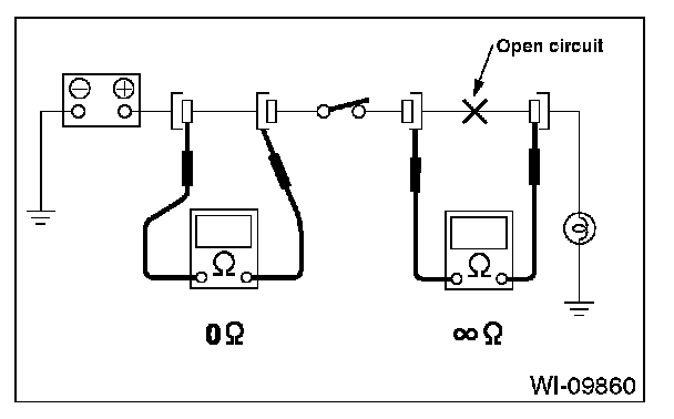 Disconnect all connectors affected, and check continuity in the wiring between adjacent connectors. When the ohmmeter indicates infinite , the wiring is open.