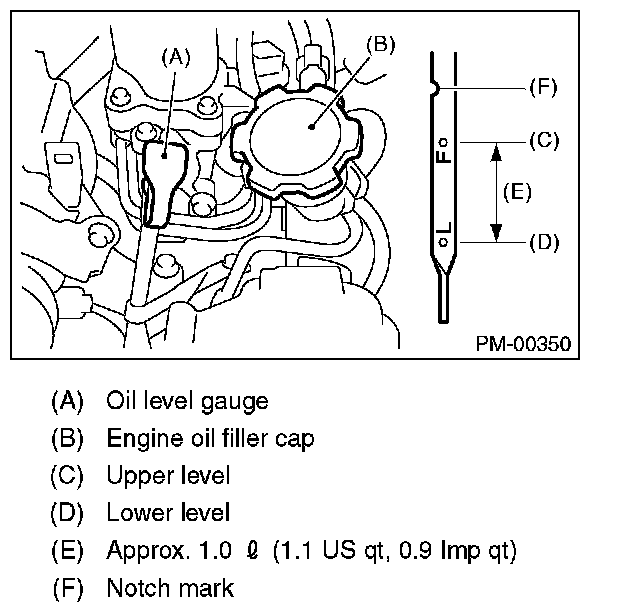 13) After the engine stops, recheck the oil level. If necessary, add engine oil up to the "F" line on the oil level gauge.