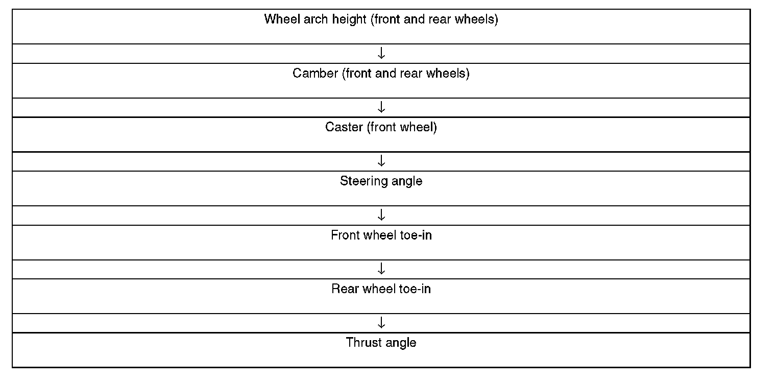 Check, adjust and measure the wheel alignment in accordance with the procedures indicated in the figure.