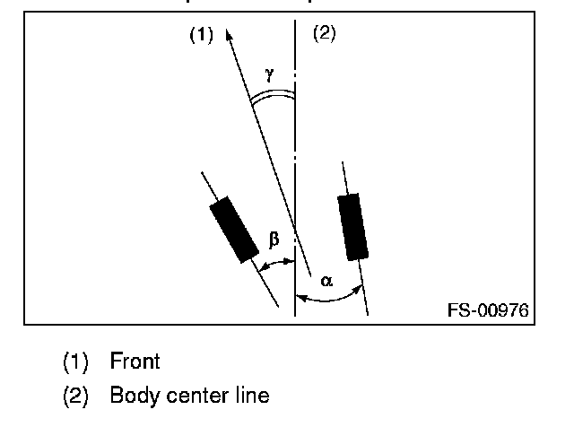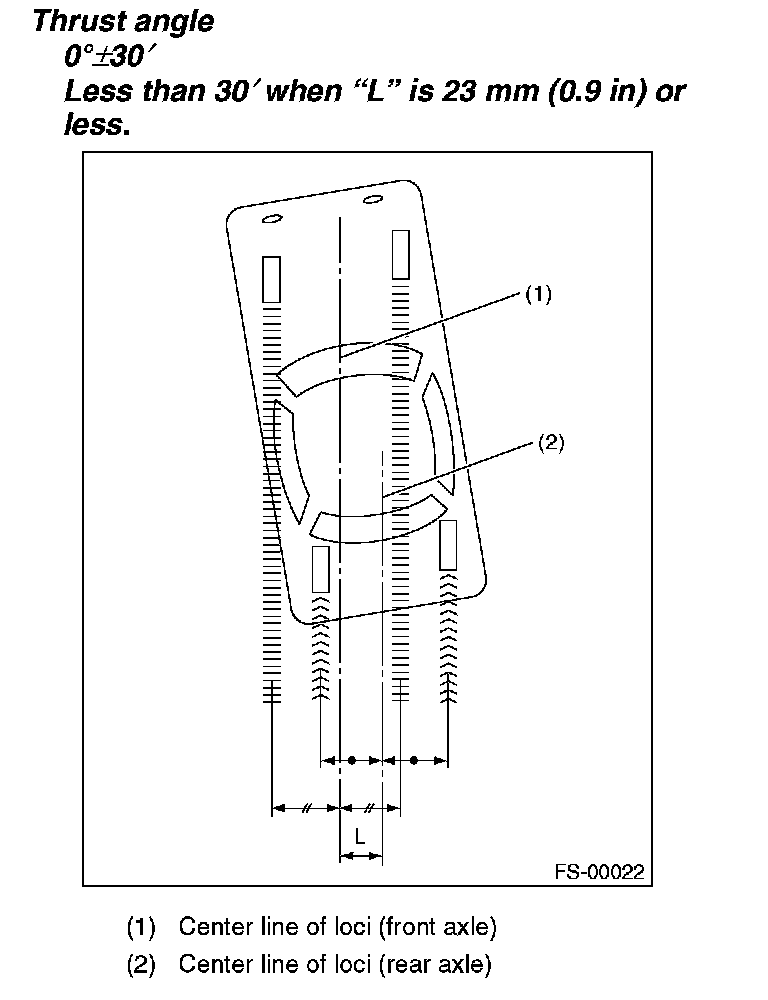 NOTE: Thrust angle is a mean value of left and right wheel toe angles in relation to the vehicle body center line. Vehicle is driven straight in the thrust angle direction while slanting in the oblique direction depending on the degree of the mean thrust angle.