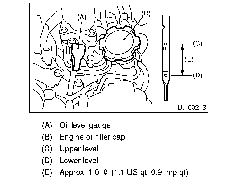 4) Remove the oil level gauge again and check the reading. If the engine oil level is below "L" line, add oil to bring the level up to "F" line.