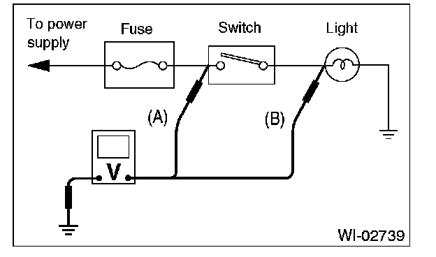 2. Contact the positive lead of the voltmeter on connector (A). The voltmeter will indicate a voltage.