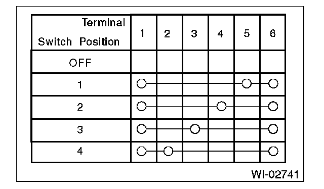 3. The symbol "0-0" indicates that continuity exists between two points or terminals. For example, when a switch position is at "3", continuity exists among terminals 1, 3 and 6, as shown in the table.