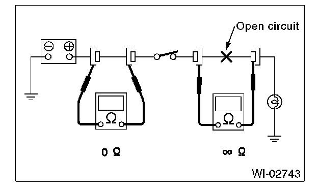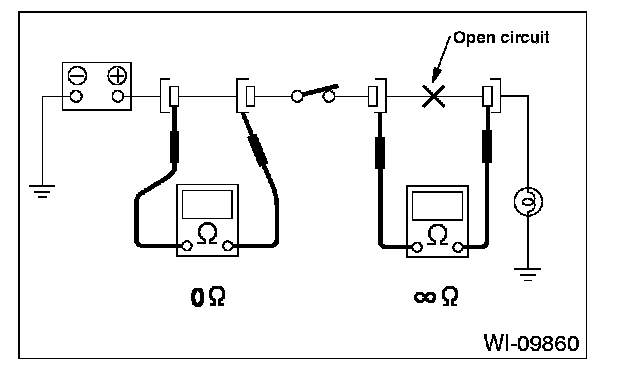 Disconnect all connectors affected, and check continuity in the wiring between adjacent connectors. When the ohmmeter indicates infinite , the wiring is open.
