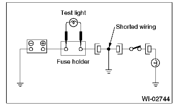 Connect a test light (rated at approx. 3 watts) in place of the blown fuse and allow current to flow through the circuit. Disconnect one connector at a time from the circuit. Starting with the one located farthest from the power supply. If the test light goes out when a connector is disconnected, the wiring between that connector and the next connector (farther from the power supply) is shorted.
